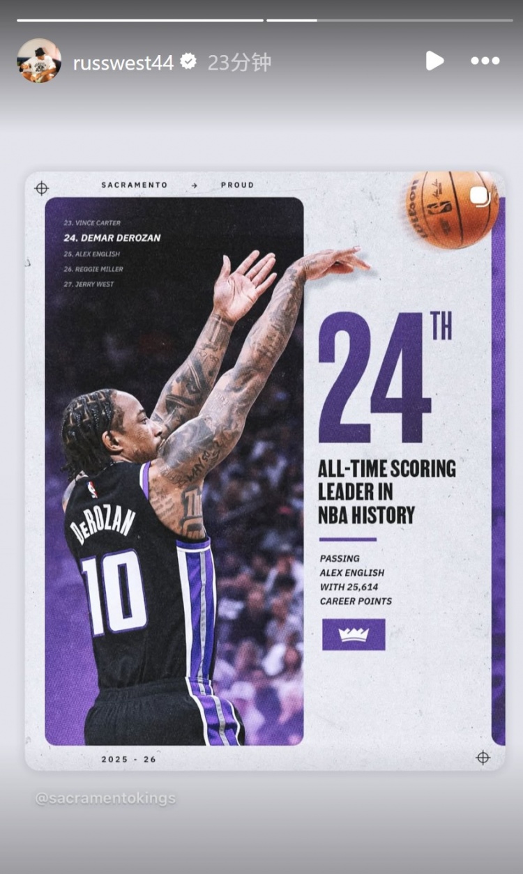 2025-11-25 16:11:12哥倆好!德羅贊總得分升至歷史第24 威少INS轉發該里程碑