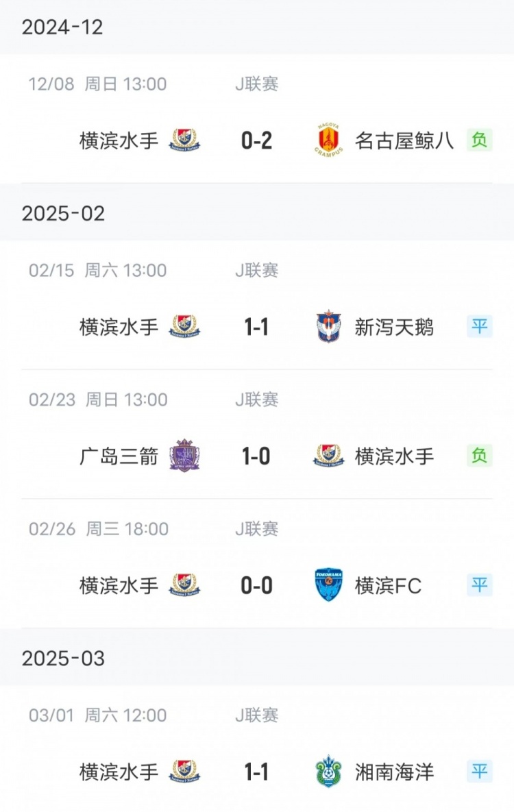 數據顯示,本賽季J聯賽戰罷5輪,橫濱水手還未嘗勝績,4輪聯賽(橫濱少賽一場)僅3平1負打進2球,目前積3分排在J聯賽積分榜第18位。而算上上賽季的話,橫濱水手在J聯賽已經連續5場不勝(3平2負打進2球丟掉5球)。