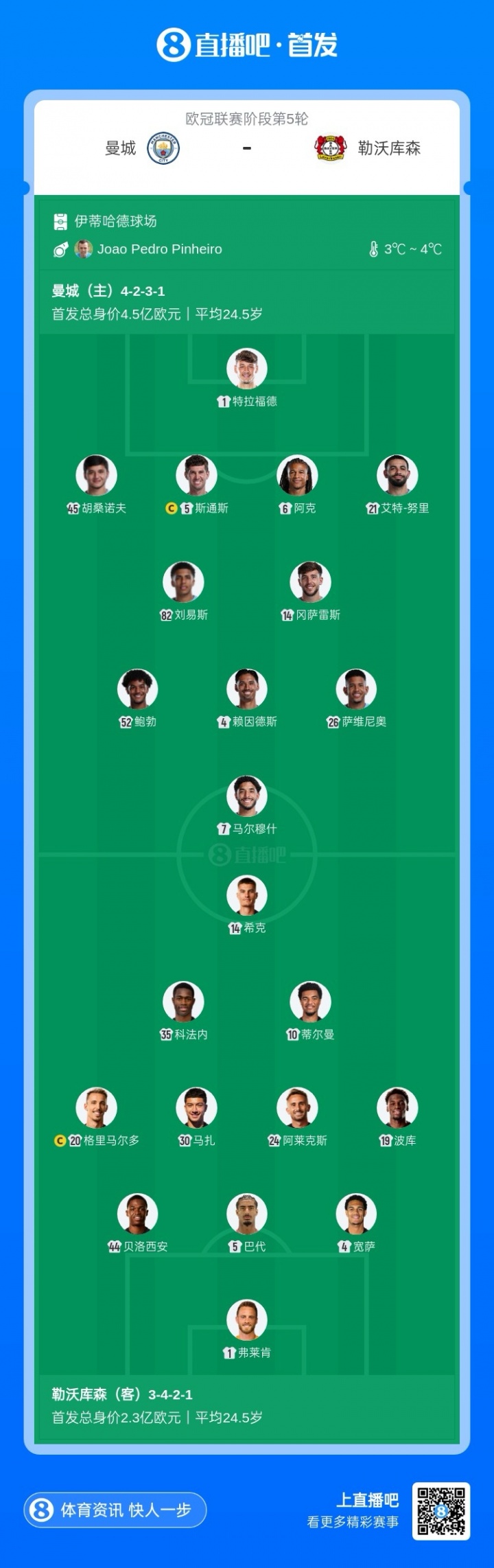 11月26日訊 歐冠聯賽階段第5輪,曼城主場迎戰勒沃庫森,賽前雙方首發公布。【曼城本場大幅輪換,馬爾穆什、賴因德斯、胡桑諾夫悉數先發,哈蘭德、福登、B席坐鎮替補;藥廠方面,希克、格里馬爾多、寬薩先發出戰,本·塞吉爾、埃切維里替補待命。】